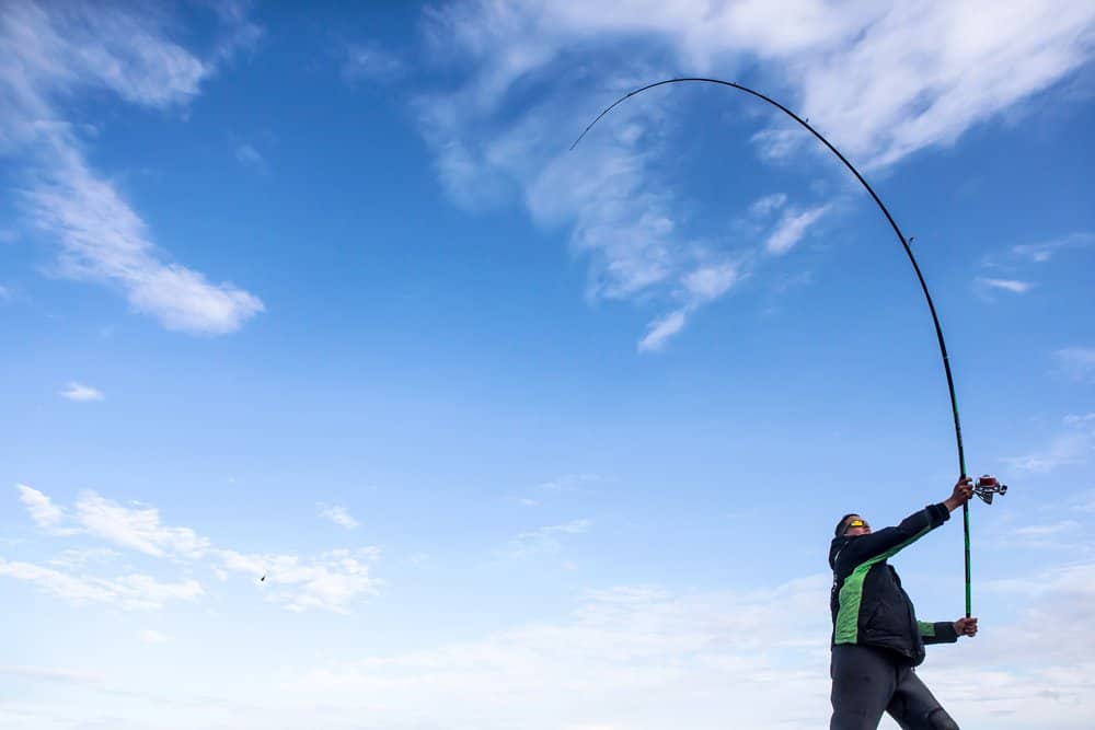 Onder het stevigere werk vanaf de dijk verstaan we grote, sterke vissen zoals haaien, roggen, zeebaarzen of gullen. Je hebt hier te maken met harde stromingen, rotspartijen en andere obstakels. ‘Rough grounds & rotten bottoms’ zouden de Engelsen zeggen. Vooral dit laatste is de reden om een stevige hengel te kiezen. Wie op het strand een goede vis haakt, kan er van uit gaan dat deze zich haast nergens in vast kan zwemmen, geduld wordt nu beloond. Vanaf de dijk hoor je optimaal de controle te houden over een flinke vis en dat gaat enkel door de druk zo hoog mogelijk te houden! Wie vanaf de dijk goed te werk wil gaan moet dan ook niet bang zijn met zwaar materiaal te vissen; ik heb al heel wat vissen zien verdwijnen voor ze überhaupt in zicht kwamen, puur omdat er met te lichte hengels gevist werd. Controle is alles! Je hengel dient hier 450 cm tot 500 cm lang te zijn met een werpgewicht van minimaal 200 gram. Zelf vis ik met hengels die 250 gram aankunnen en de aanschaf van een hengel met nog meer body staat al in de planning. Strak en robuust zijn de sleutelwoorden voor succes vanaf de dijk.