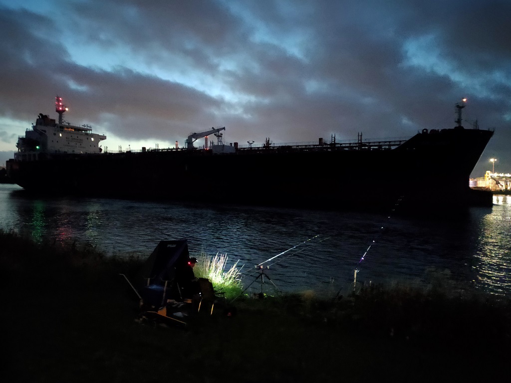 In het Noordzeekanaal vis ik altijd zonder ankers en actief slepend om de zoveel tijd. Dat werkt het best voor de tong. Ik zag al dat er een of twee kleine visjes aanzaten bij Yvonne dus even voelen of het toch iets van substantieel gewicht was.