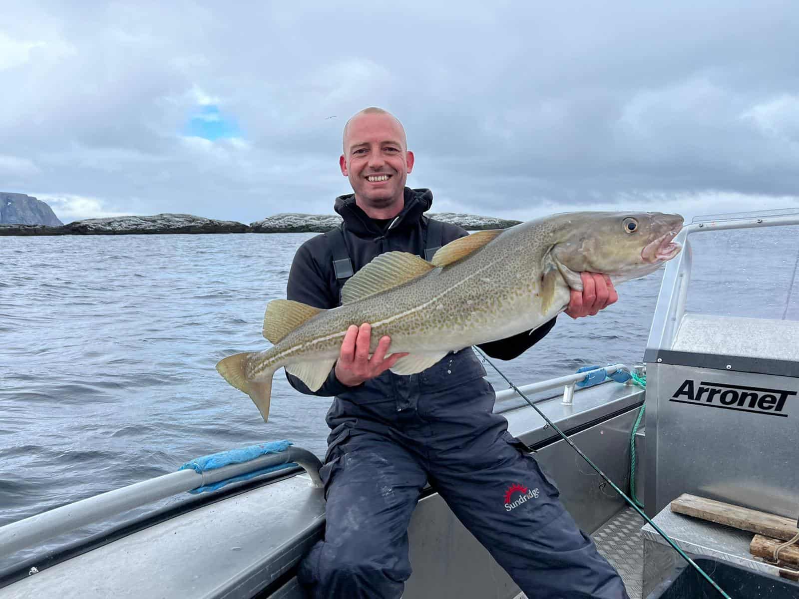 Aan het einde van de dag had iedereen dan ook een glimlach op zijn gezicht en de eerste bakken vis voor het fileren werden aangeland. Schitterende kabeljauwen van 80 tot 100 cm werden er doorlopend gevangen en zoveel als je maar wilde. Dus velen hebben hun quotum aan vis al in 1 dag vol gevist. Naast alle prachtige kabeljauwen werd er nog een kleine heilbot gevangen door Liviu. Een van de drie internationale gasten die zich hebben aangesloten bij deze groepsreis. Verder waren nog schelvis, koolvis, lom en leng van de partij.