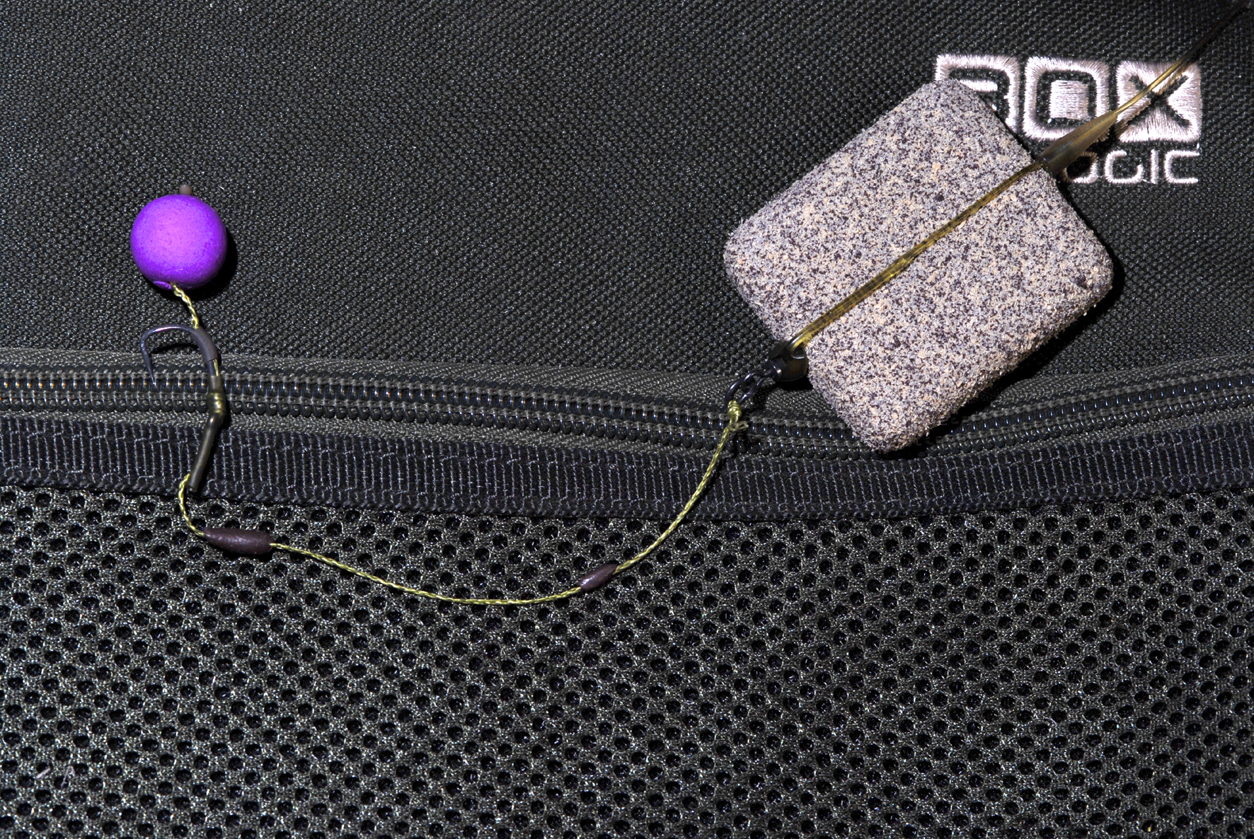 Heel belangrijk is dat je deze rig doeltreffend kunt gaan aanbieden midden in het wier en daarom is het natuurlijk van belang dat je haak zich niet gaat vastzetten in de wierstengels tijdens het afzinken naar de bodem. Hiervan ben je enkel zeker als je je haakpunt gaat maskeren. De gemakkelijkste manier is de haakpunt gaan omwikkelen met PVA tape. Echter je haak opbergen in het midden van een PVA zakje met voer is nog stukken beter.