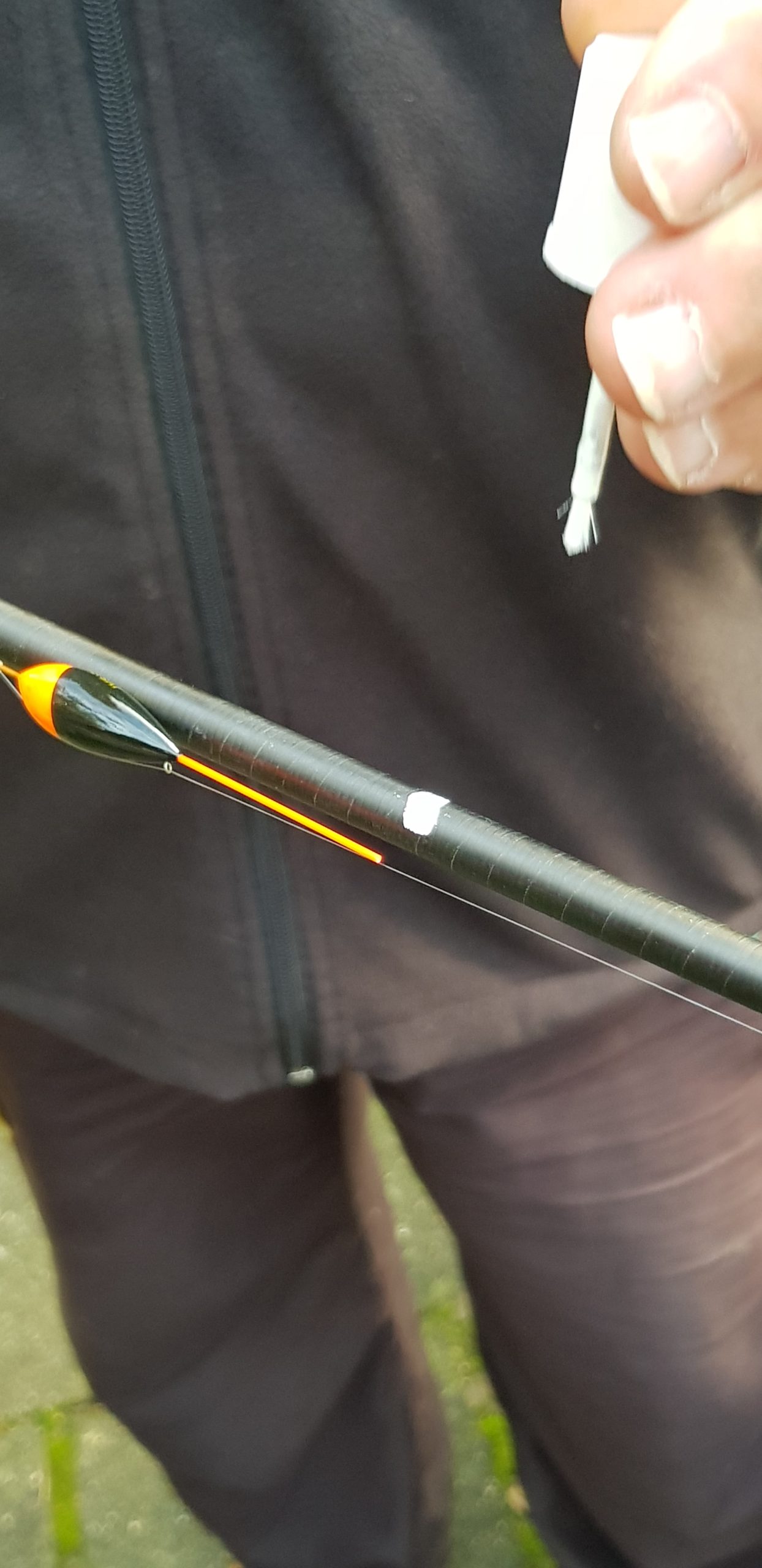 Een super oplossing is om nadat je voor de vissessie de gewenste diepte hebt uitgepeild, even de dobber, zonder spanning op de lijn, langs de hengel te houden en dan die te markeren op de hengel. Ik gebruik daar zelf altijd tipex voor, omdat het gemakkelijk ook weer van de hengel te verwijderen is. Je kunt ook eventueel vetkrijt gebruiken. Hoe vaak je ook van diepte hebt gewisseld, altijd kun je weer terugvallen naar de basis en dat op de millimeter zuiver. Zo simpel en toch zo belangrijk