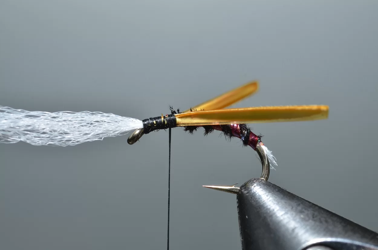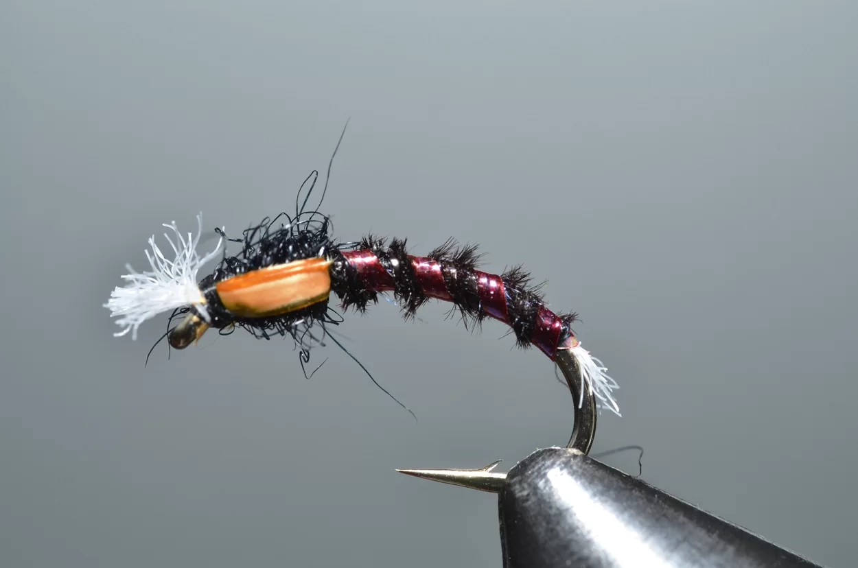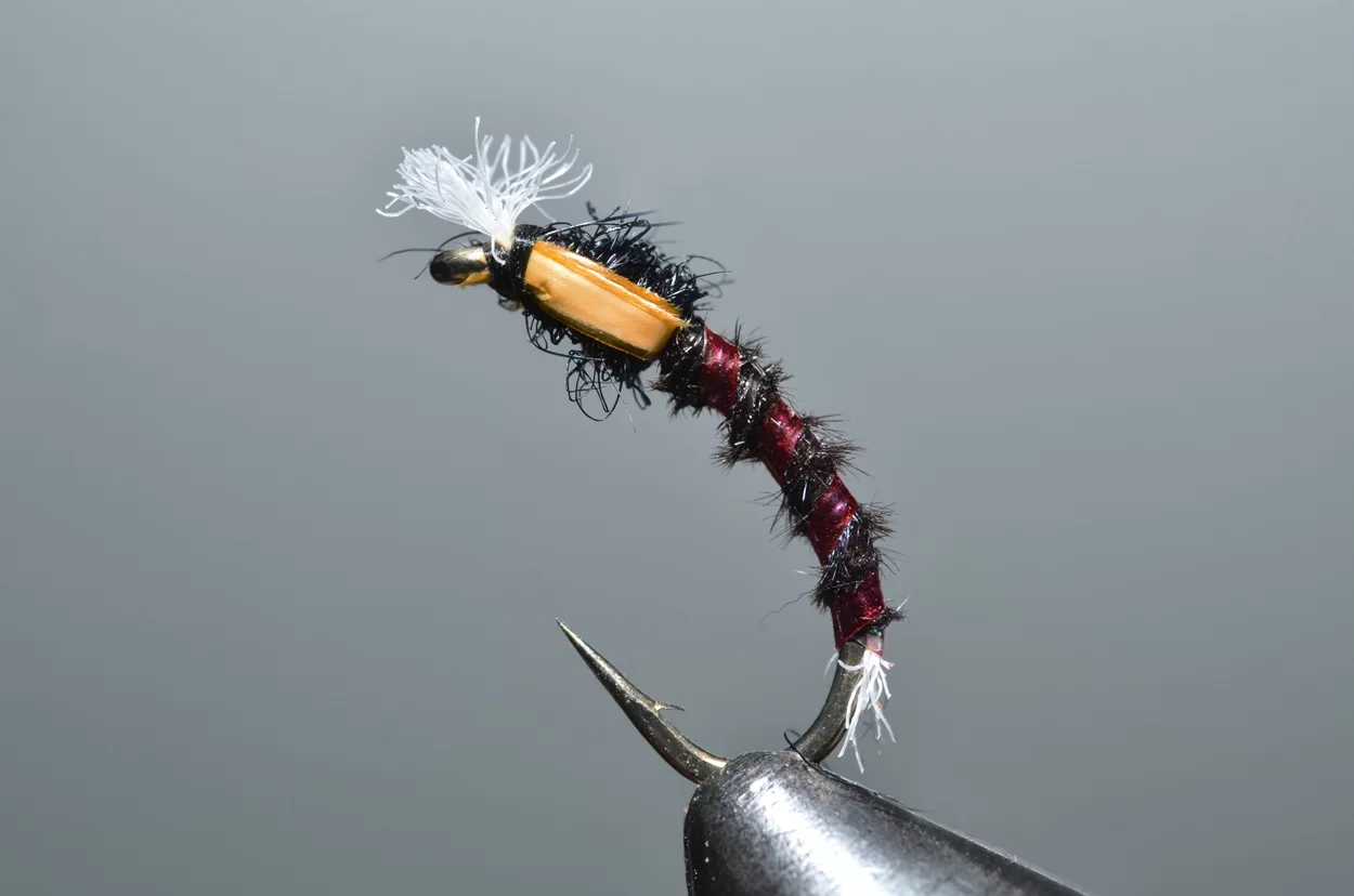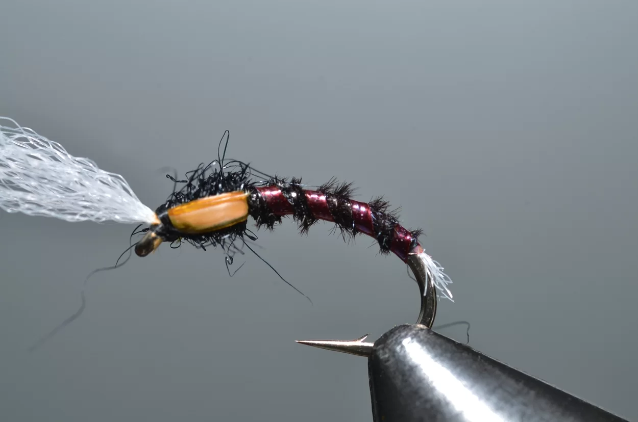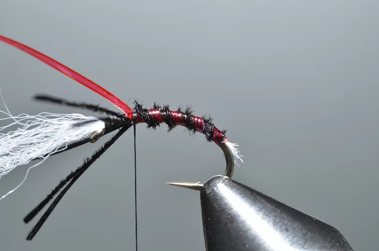 Het ‘buzzeren’ is weliswaar een heel statische visserij: een lange leader met drie buzzers, werpen, langzaam laten afzinken en de wind de rest laten doen. Ook al zie je ze niet, de forellen kruisen actief op een diepte tot drie meter, op zoek naar de stijgende poppen. De aanbeten zul je echt wel merken. Voor onze Vlieg van de Maand kijken we eens naar een patroontje van Davie McPhail. Heel klassiek, met dit verschil dat hij de pearl mylar met een watervaste viltstift donkerrood kleurt.