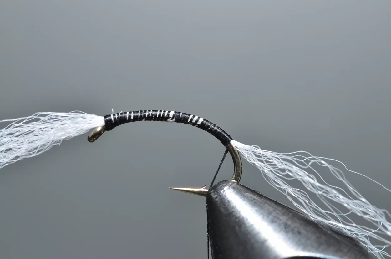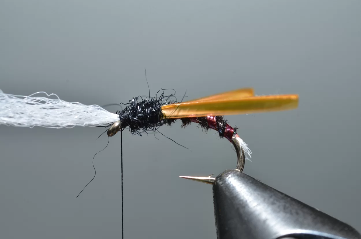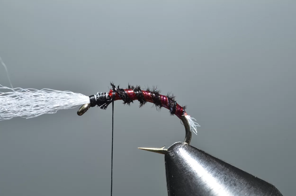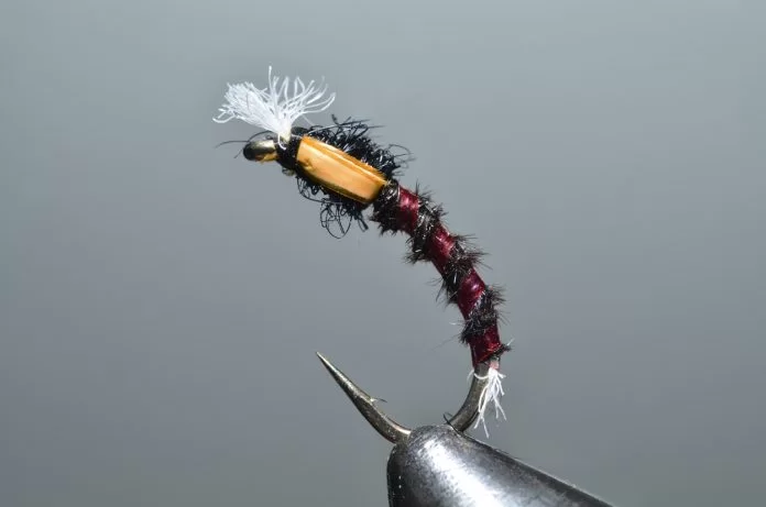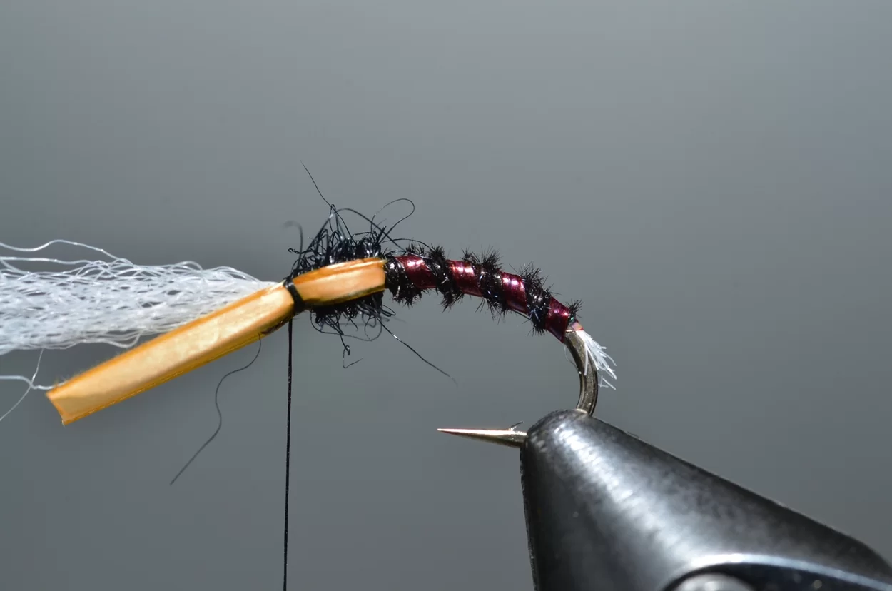 Het ‘buzzeren’ is weliswaar een heel statische visserij: een lange leader met drie buzzers, werpen, langzaam laten afzinken en de wind de rest laten doen. Ook al zie je ze niet, de forellen kruisen actief op een diepte tot drie meter, op zoek naar de stijgende poppen. De aanbeten zul je echt wel merken. Voor onze Vlieg van de Maand kijken we eens naar een patroontje van Davie McPhail. Heel klassiek, met dit verschil dat hij de pearl mylar met een watervaste viltstift donkerrood kleurt.