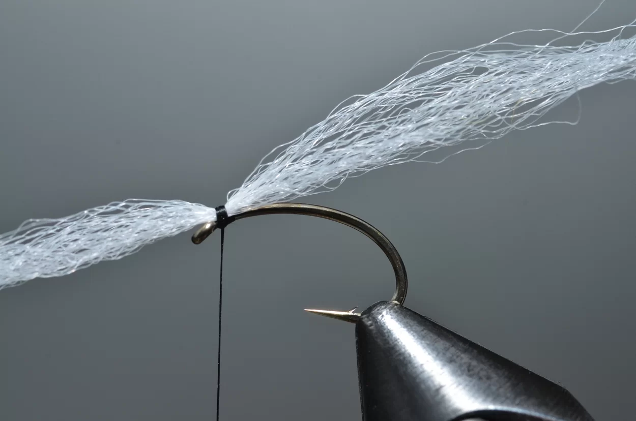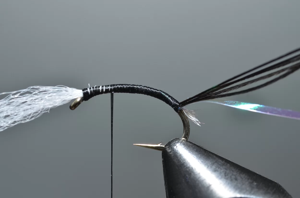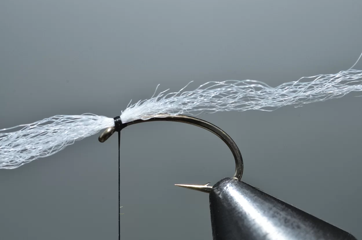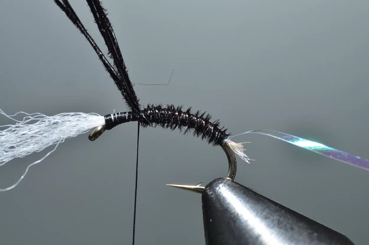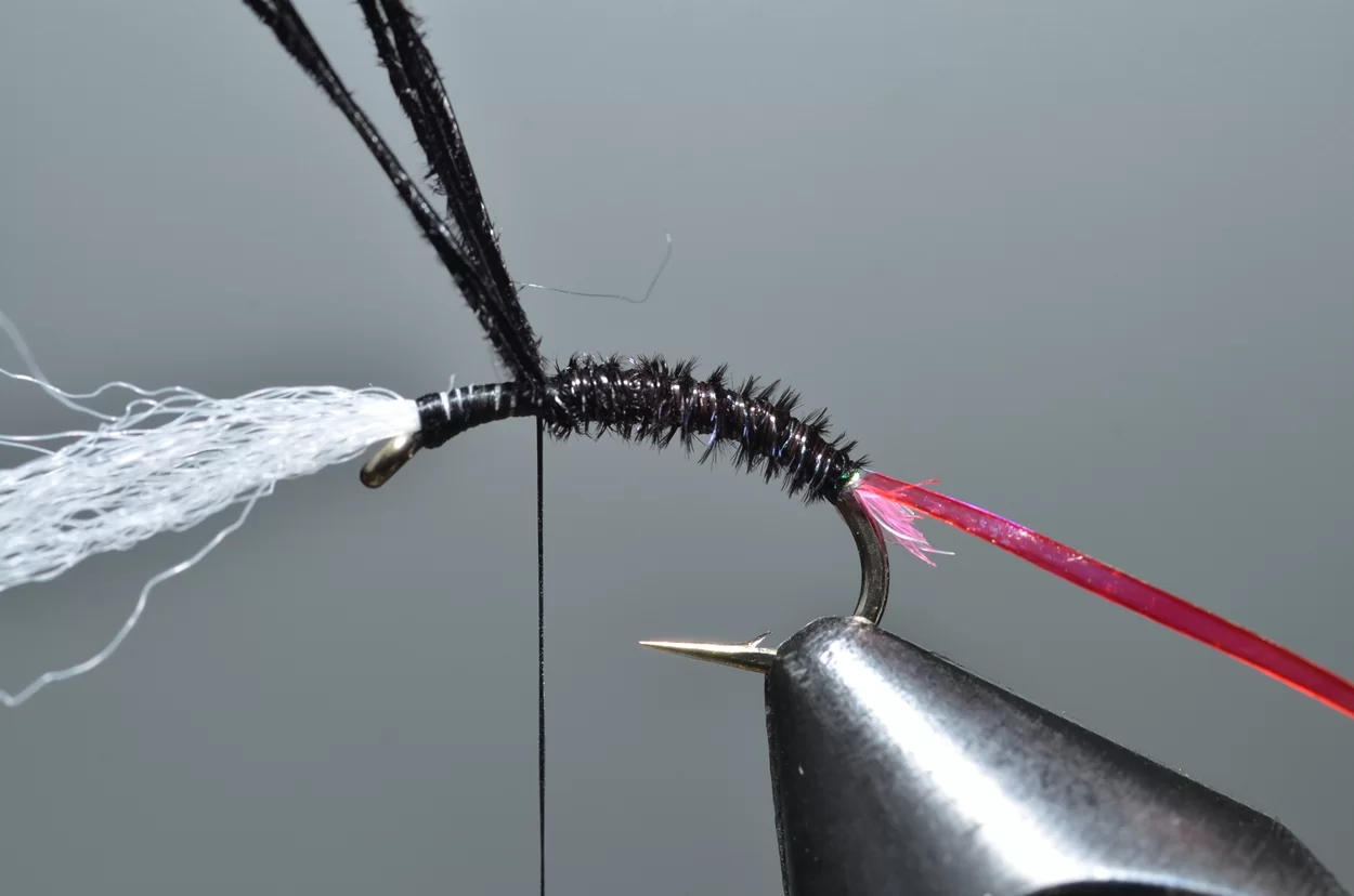 Het ‘buzzeren’ is weliswaar een heel statische visserij: een lange leader met drie buzzers, werpen, langzaam laten afzinken en de wind de rest laten doen. Ook al zie je ze niet, de forellen kruisen actief op een diepte tot drie meter, op zoek naar de stijgende poppen. De aanbeten zul je echt wel merken. Voor onze Vlieg van de Maand kijken we eens naar een patroontje van Davie McPhail. Heel klassiek, met dit verschil dat hij de pearl mylar met een watervaste viltstift donkerrood kleurt.