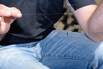- Knoop nu beide lijnen nogmaals aan elkaar, 2x doorhalen en de lijn waaraan de wartel hangt 2 cm langer houden.