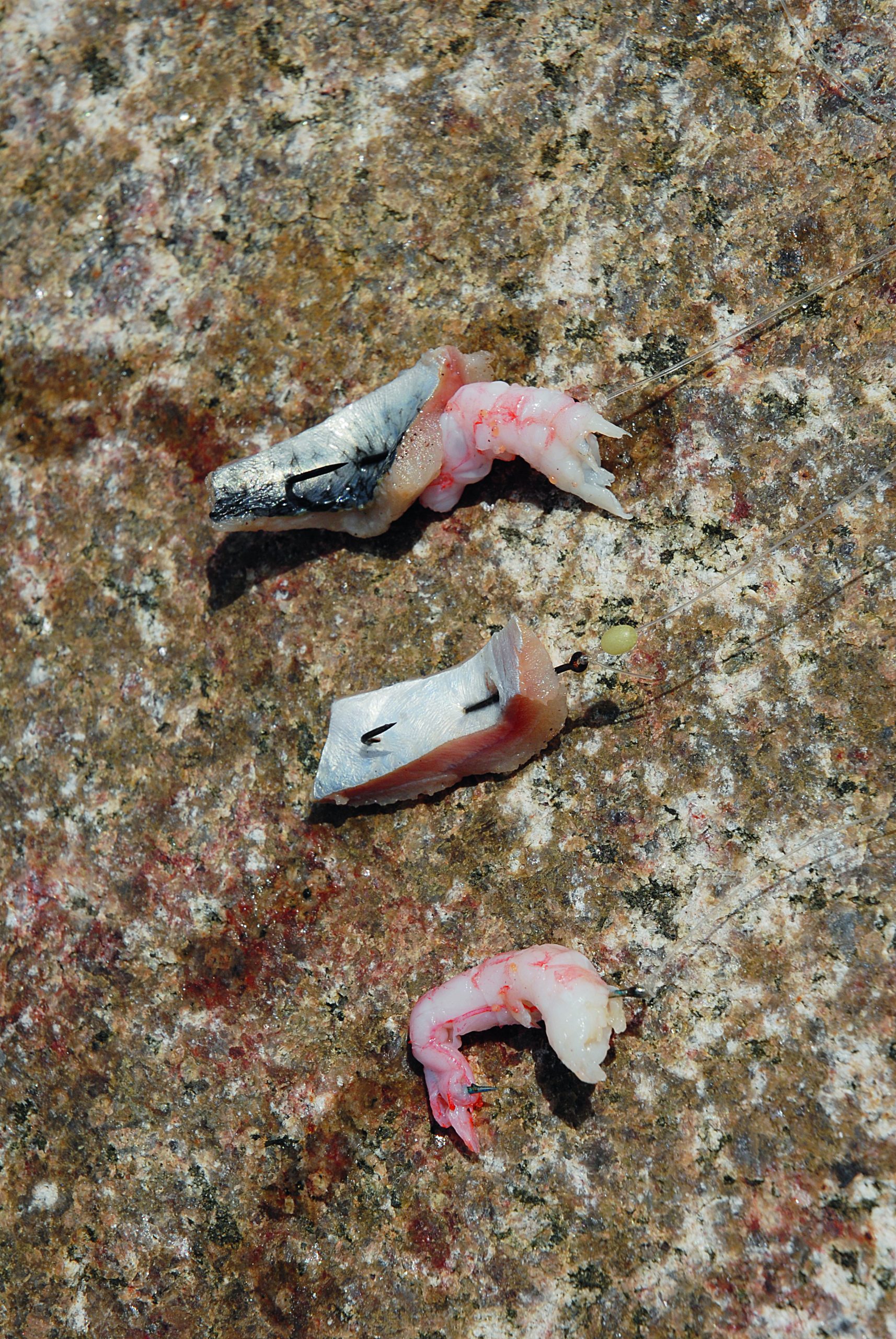 Zorg dat het aas niet te zwaar is, zodat het geheel blijft zweven. Reepjes vis, zagers en garnalen werken goed; eventueel verstevig je zacht aas met baitelastiek. Op rustige dagen kun je deze techniek ook uitstekend uitvoeren met een karper- of feederhengel.