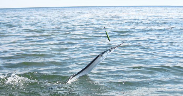 - Uiterlijk: Slank lichaam met sikkelvormige vinnen en een spitse snavel vol kleine, scherpe tanden. De graten zijn opvallend groen.