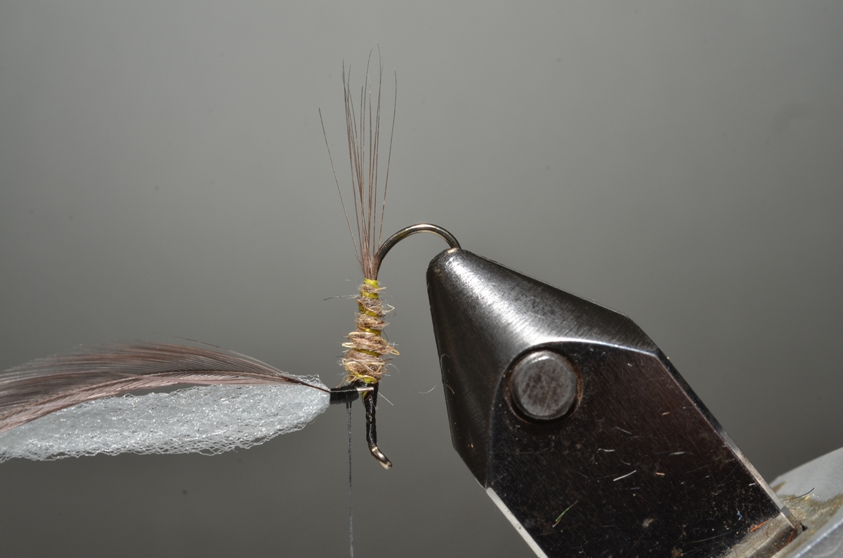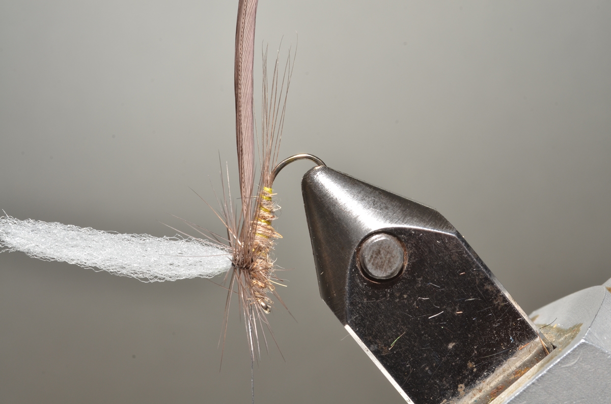 Gebruik indien mogelijk uitsluitend genetische zadelhackles van een goede kwaliteit. Derde keus hackles en andere minderwaardige producten hebben vaak een in verhouding veel te dik schachtje, waardoor de wikkelingen te hoog ‘gestapeld’ liggen. De bovenste fibertjes raken het wateroppervlak niet en vormen enkel maar een extra gewichtsbelasting voor de fibertjes die dat wel doen en door middel van de oppervlaktespanning het vliegje drijvend moeten houden. Dit is een tekortkoming die we vaak aantreffen bij goedkope en slordig gebonden kant-en-klare ‘koopvliegen’.
