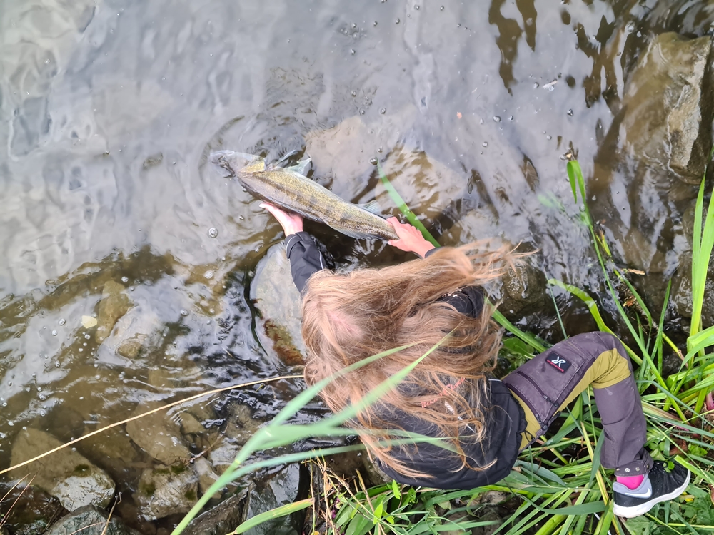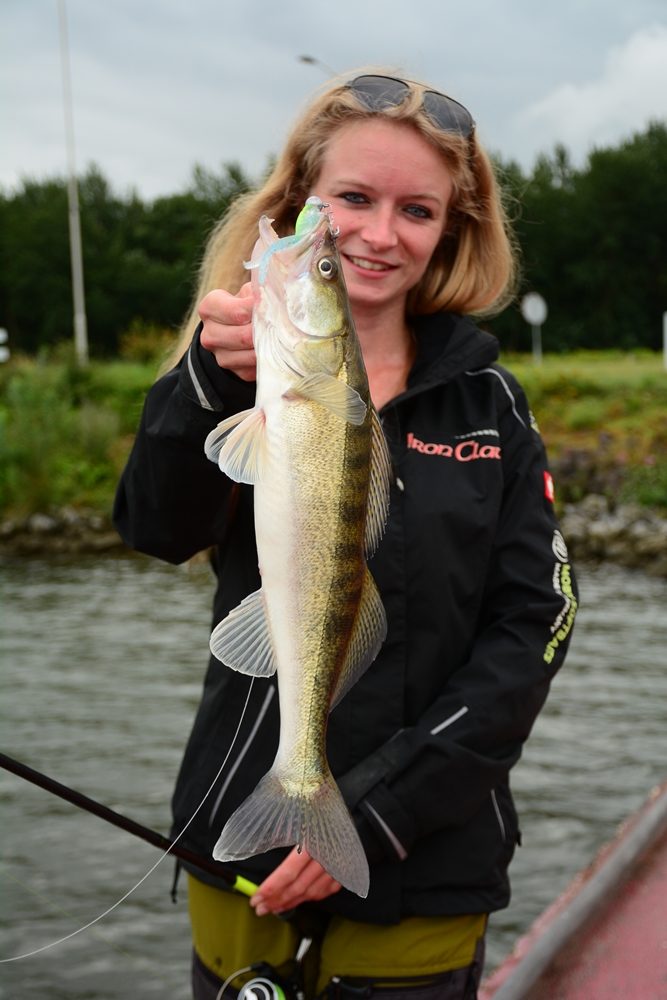 Al na twee worpen is het Alex die de eerste vis van de dag mag noteren: een fraaie snoek van zo’n 70 centimeter. Niet veel later klinkt er van Jasmin een verlossende “yes, dit is een snoekbaars!”, waar ze even later mee op de foto gaat en released in het water. “Ik heb eerlijk gezegd nog nooit een snoekbaars mee naar huis genomen. Ik ben een echte catch & release visser”. Na deze 60’er snoekbaars staat ze drie minuten later weer met een kromme hengel, alweer een snoekbaars; nog steeds een mooie vis, maar wel een tikje kleiner dan de vis van zojuist. Na een helaas geloste, grote baars vangt ook Alex nog een mooie snoekbaars. Een flitsende start, dit alles in een tijdsbestek van een half uur!