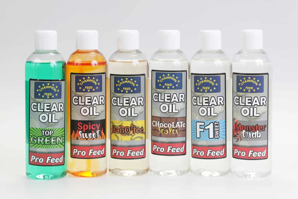 De Pro Feed – Clear Oil is verkrijgbaar in verschillende smaken, zoals BanO’fee, Chocolate Scopex, F1 Sweet, Krill & Squid, Monster Crab, Spicy Sweet en Top Green.