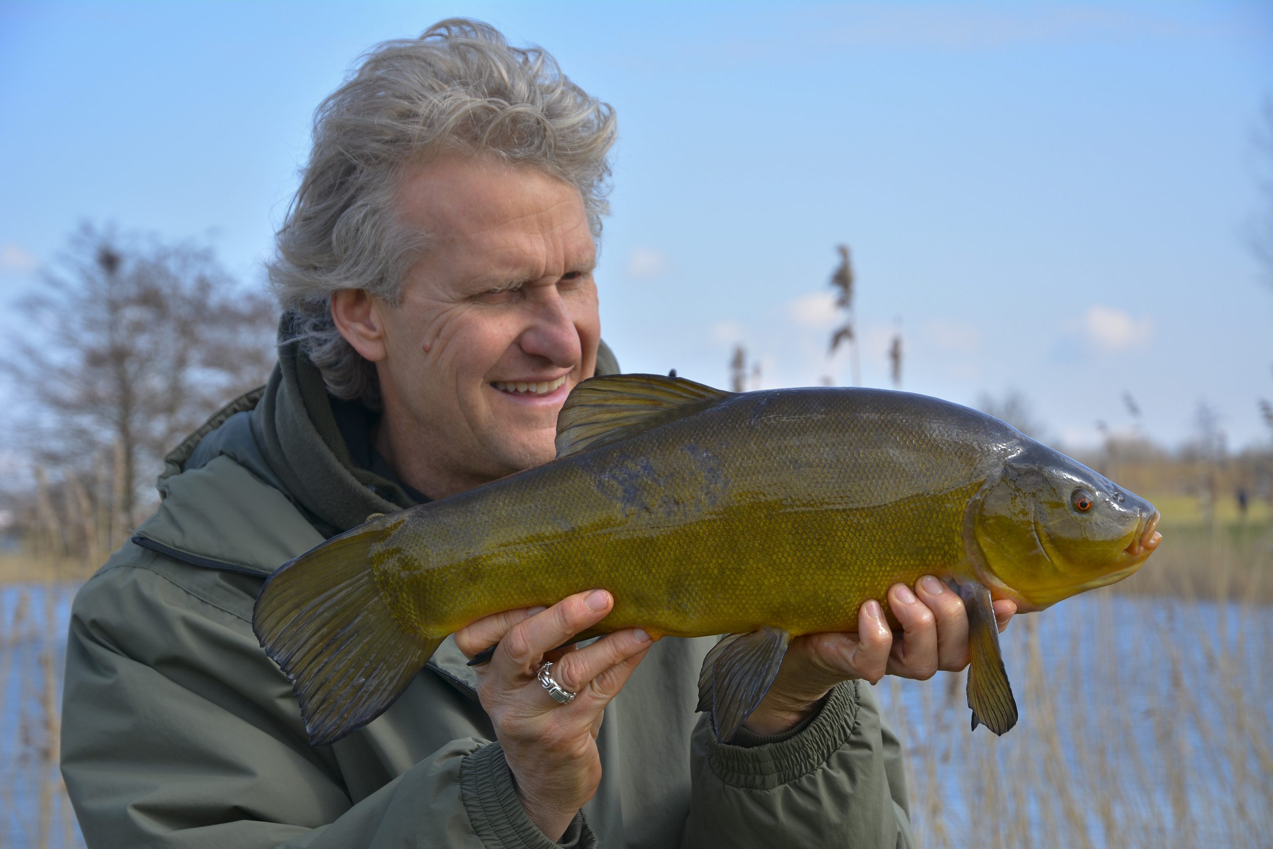 Vismaat Hans met een bijzondere mooi gekleurde zeelt in het opwarmende lentezonnetje.