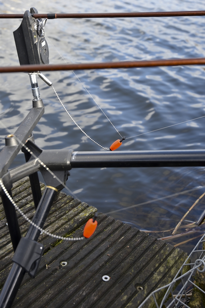Als haak gebruiken we graag de Drennan Barbel Specimen in de maten 11, 12 en 14. Uiterst scherp, sterk en een roundbend-model. Gezien de zachtere en kleinere bek en uit zorg voor de vis, vinden we kleine haken een must. Zeelt is tenslotte geen karper. De haak knopen we met een no-knot aan een zinkende braid van 8-10 lb van circa 8-10 cm. Houd het hairtje kort; zeelt zuigt het aas meestal niet ver naar binnen… Ideaal is een lusje met baitbandje voor een waftertje. Voor maden gebruiken we een Fox Maggotclip L. Aan het eind een lusje en een zachte sleeve zodat deze makkelijk op een quick change swivel geschoven kan worden. De madenkorf plak je grotendeels dicht met watervast tape, zodat de maden vlak bij het haakaas naar buiten komen. Extra voordeel: je kunt zo je rig wat langer laten liggen en wat rust op je stek creëren.