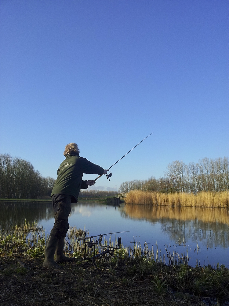 Bij aankomst op de stek voeren we eerst wat balletjes voer zodat dit z’n werk kan doen tijdens het optuigen. In het vroege voorjaar voeren en vissen we erg compact, omdat de vis nog niet heel veel zwemt. Met verschillend haakaas kun je erachter komen wat beter loopt: levend aas of juist iets anders. Afhankelijk van de beten kun je regelmatig voer bijbrengen; twee of drie balletjes zijn genoeg. We moeten ze gretig houden tenslotte.