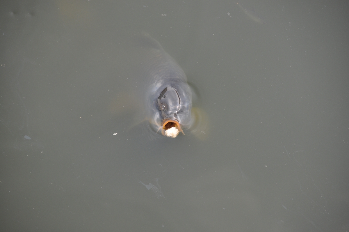 Als de karpers passief in het oppervlak liggen, is het vaak moeilijk om een aanbeet uit te lokken. Zeker als er geen plompen of andere planten in de buurt liggen. Als ze geen beschutting hebben, zijn ze vaak wat bewuster van hun omgeving. Zodoende schrikken ze wat sneller als er ineens een enkele korst in hun blikveld verschijnt! Wat brood of kattenbrokken voeren kan soms helpen om ze actiever te krijgen. Maar zeker graskarpers die de klappen van de zweep kennen, zijn hier niet van gediend! Een oplossing die mij regelmatig wat moeilijk vangbare vissen oplevert, is het vissen net onder het wateroppervlak. Ik schuif mijn dobbertje, zonder lood, op 10-15 cm boven de haak. Afhankelijk van hoe hoog de vissen in het water liggen. Daar komt een vlokje brood aan, ter grootte van een vingernagel. Erg klein dus! Die laat ik dan richting de vissen drijven. Dit wordt vaak niet als gevaarlijk gezien en alsnog gepakt!
