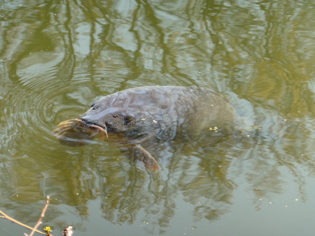 Tijdens mijn ronde langs wat wateren stuit ik op een schooltje karpers in een klein slootje. Een stuk of vijf schubs en een wat grotere spiegel. De laatste trekt uiteraard het meest mijn aandacht! Ze zwemmen onrustig wat heen en weer. Maar af en toe duiken ze de kant in om tussen de planten wat voedsel bijeen te schrapen. Er liggen dus kansen! Als ik een vlokje brood langzaam laat afzinken in de zwemroute van de spiegel, wordt deze glashard genegeerd! Mogelijkheden voor de schubs zijn er wel, maar dan verstoor ik de hele school. Ik besluit om ze te volgen en gewoon mijn kans op de spiegel af te wachten.