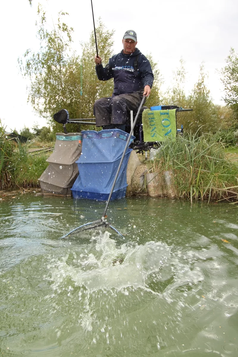 Terwijl Tommy uitlegt hoe deze techniek werkt, kijken wij toe hoe hij vis na vis succesvol landt. Elke aanbeet resulteert in vis in het landingsnet en zelfs de – toch erg sterke – karpers worden door het korte hengeltje prima opgevangen. “Wanneer deze techniek op jouw water nog niet uitgevoerd wordt, dan móet je hem proberen! Ik vang de hele dag door dankzij deze techniek, het is alsof de vissen voorgeprogrammeerd zijn om zich op dertien meter afstand van de oever te bevinden”.