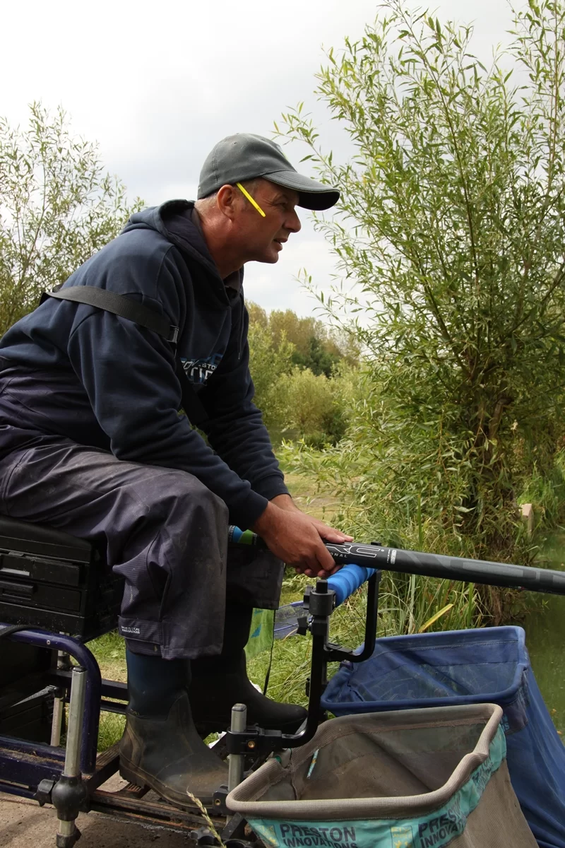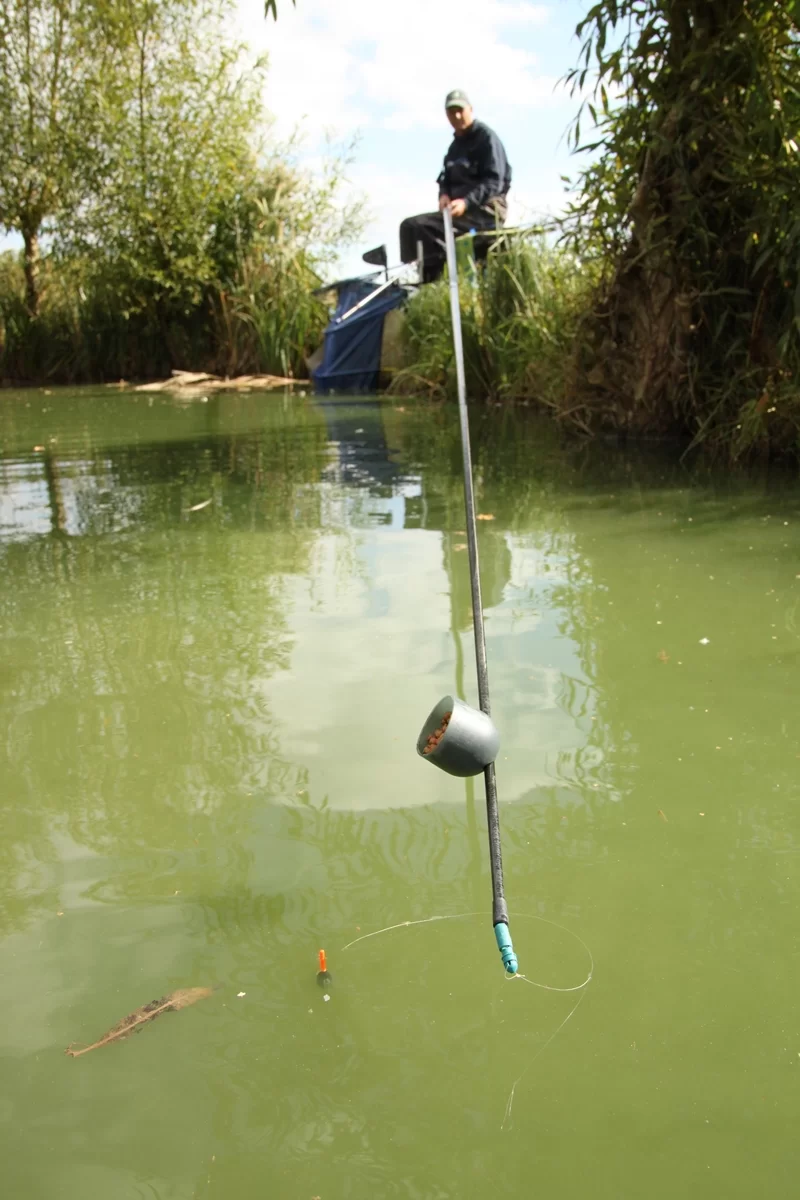 Een valsgehaakte karper aan de vaste stok, tijd om over te stappen op de method.