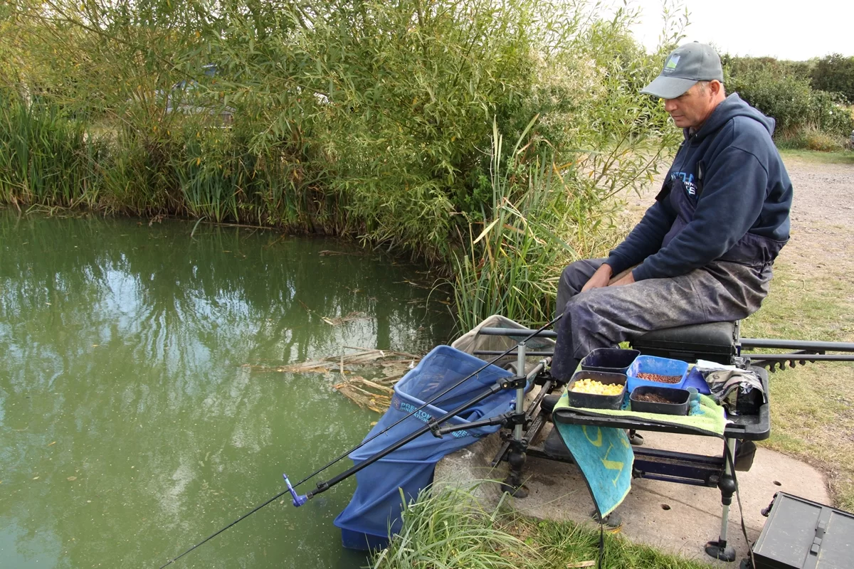 Een valsgehaakte karper aan de vaste stok, tijd om over te stappen op de method.