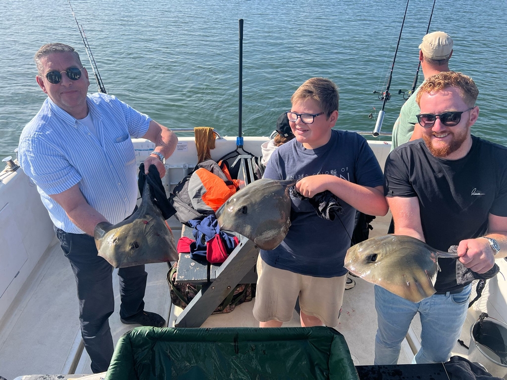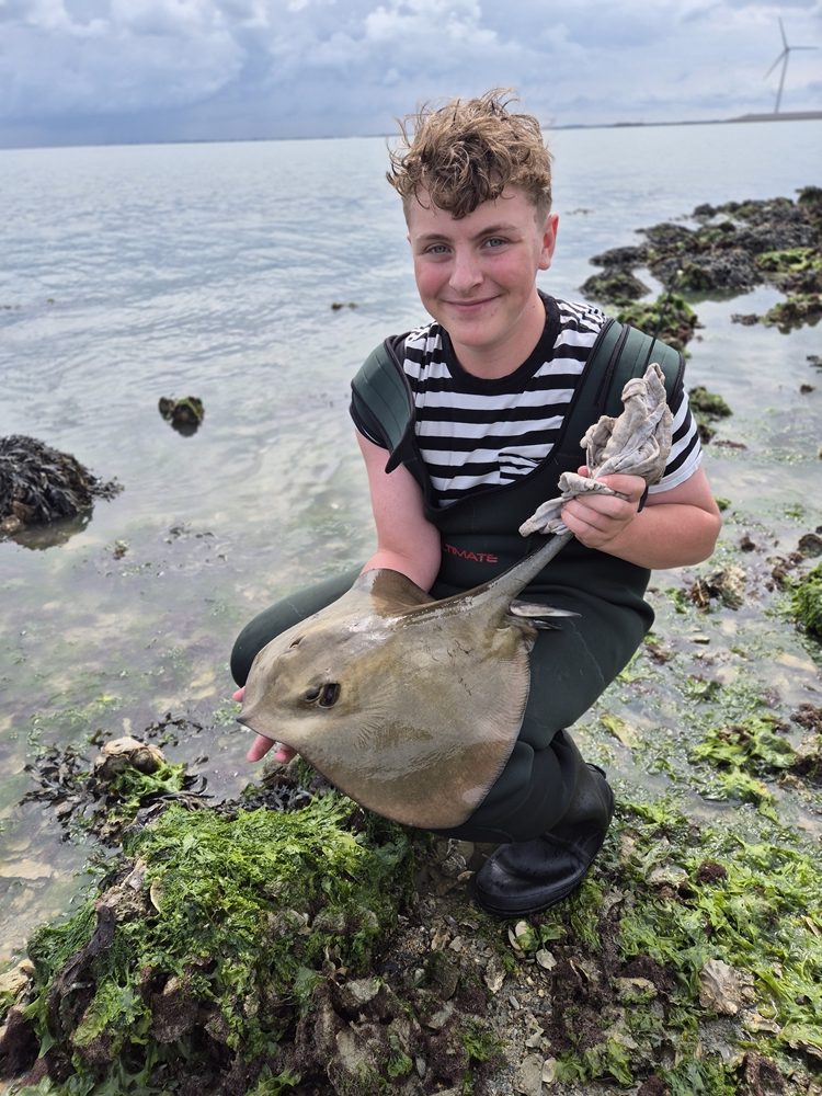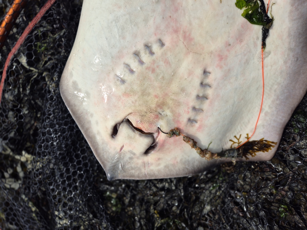 We besloten dus op rog te gaan en zorgden voor een ruime hoeveelheid steekzagers. Die dag brachten we een voertje mee van vermalen krabben in visolie, en daar gooiden we van tijd tot tijd een beetje overboord. Zodra we dat deden begonnen de roggen het goed te doen, en ik ben er dan ook van overtuigd dat dit een verschil kan maken. De les die we die dag kregen was ook wel om eigenlijk altijd twee schepnetten mee te nemen. Vaak krijg je namelijk op meerdere hengels kort na elkaar beet, en dan behoren twee of drie roggen tegelijkertijd aan boord ook zeker tot de mogelijkheden. Meestal gaat het dan om een grote dame gevolgd door een of twee kleinere mannetjes. Het verschil zit hem in de buikvinnen: bij de mannen hangen hier de twee zogenaamde ‘claspers’ tussen. Die dag hebben we allemaal ons deel roggen kunnen vangen van verschillende formaten…