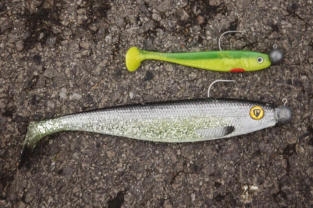 Deze shads leverden heilbot op: Fox Zander Pro in wit/chartreuse, Fox Rage Spikey shad in groen en de Quantum Soft Lure Q Paddler in groen met oranje peddel.