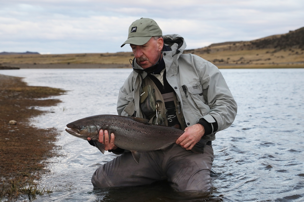 Terwijl Paul en de gids voor me poseren met een grote bruine forel in de handen, hoor ik achter me een schreeuw: “Fish On!” Ik draai me om en zie hoe een grote zeeforel aan de vliegenhengel van Glenda, half in en half uit het water, het wateroppervlak tot schuim slaat...