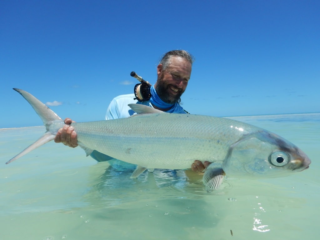 De gidsen hier weten dat precies en ze weten ook waar op welk moment de bonefish zich bevindt. Als je een school met bonefish gevonden hebt, probeer je altijd de route van de school in te schatten. Probeer nooit je vlieg in het midden van de school te werpen, dan kan je wel eens de volledige school wegjagen of verstoren. Probeer daarom altijd de vlieg op een meter of 2 van de zijkant van de school te presenteren. Tijdens het langzaam strippen met lange halen voel je de bonefish aan de vlieg nibbelen tot hij de vlieg volledig pakt. Bij het pakken van de vlieg blijf je de hengeltop laag houden en zet je de haak met een iets snellere strip en dan breekt de hel los. In een fractie van een seconde trekt de bonefish de volledige vliegenlijn van de reel en nog een heel stuk van de backing. Deze vissen zijn voor hun grootte enorm sterk en nemen verschillende runs voor je ze kan landen.