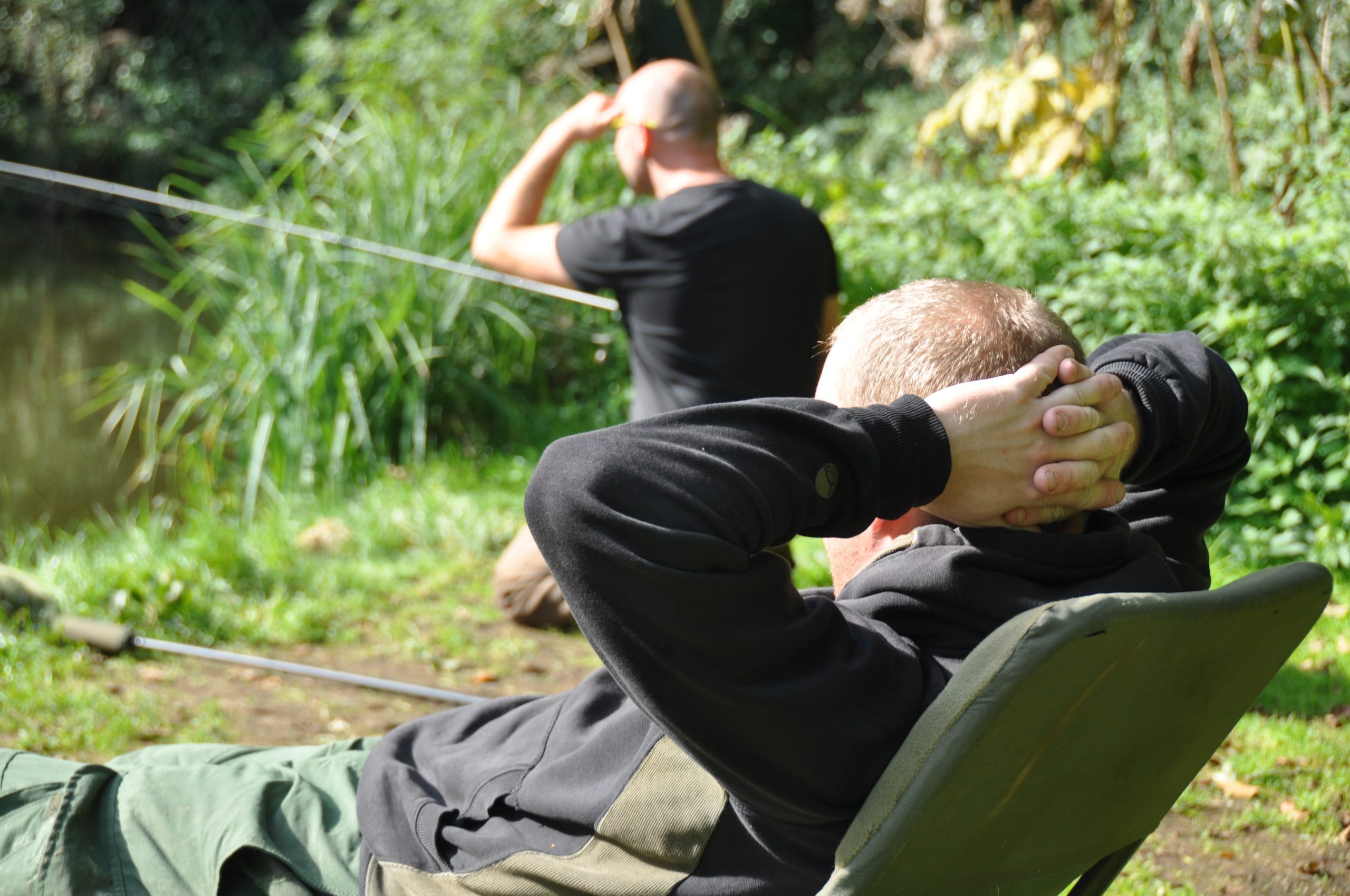Bovenal heeft Jamie toch wel de mooiste stek te pakken; een oeverrand met overhangende en verzonken struiken. Een echte holding area voor karper en al helemaal bij de omstandigheden van vandaag. Na een periode van veel regen, overheerst deze dag de zon en die is nog bijna zomers warm. Ook is er nauwelijks wind, waarbij we ons afvragen of die hier überhaupt wel eens een stempel kan drukken; de vijver is omringd met hoge bomen. Het zijn de omstandigheden waarbij je verwacht dat karper er niet lustig op uit trekt voor voedsel. De hoge luchtdruk van deze dag sterkt dat vermoeden. Onze geschubde vrienden zullen nu eerder beschutting en schaduw op zoeken.