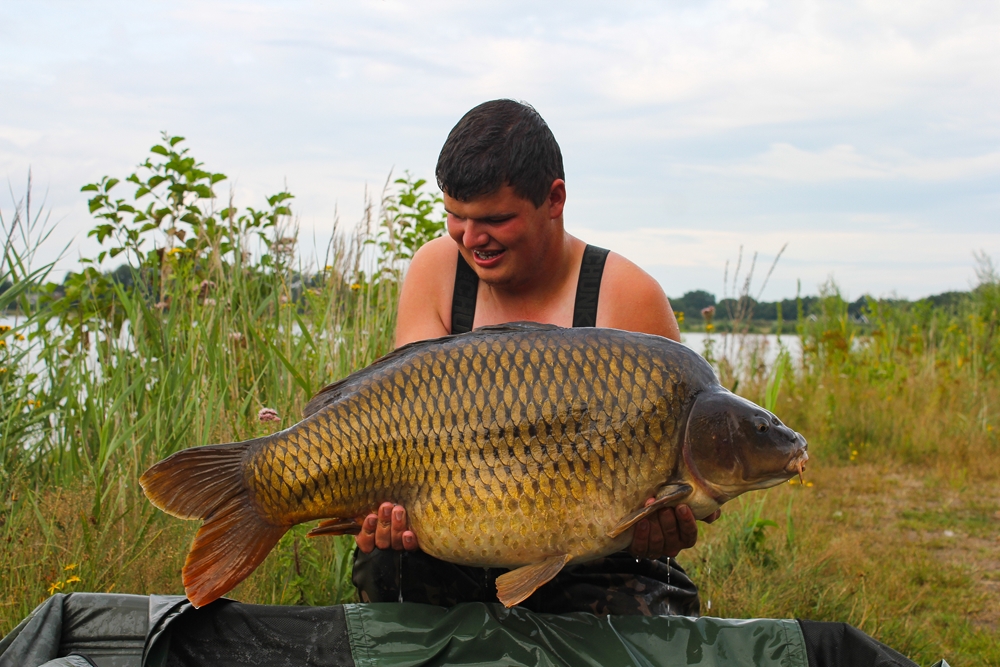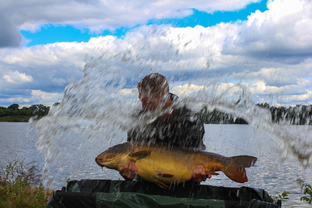 Dinsdagmiddag resulteerde dit in een volgende run en meteen pakte ik de boot om de vis achter het talud vandaan te halen, weg van de scherpe rand. Eenmaal boven de vis en de eerste glimp van de vis gezien te hebben dachten we beide dat het een kleinere spiegel was. Het bleek echter een 22 kg spiegel te zijn en werd mijn oude record verbroken! Wat een heerlijk gevoel was dat zeg! Uiteraard werd dit gevierd met een nat pak.