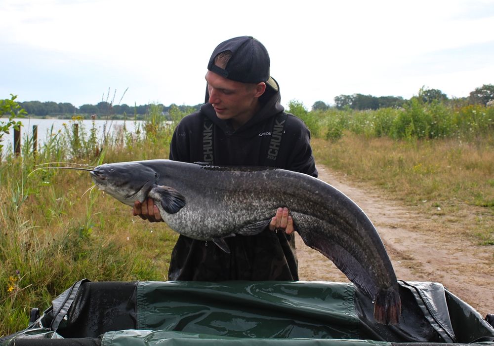 Vrijdagochtend kreeg ik dan toch nog bij het eerste beetje licht weer een keiharde run op de verre hengel. Het voelde ditmaal niet als een karper en een steur zou wel hebben gesprongen…. Minuten tikten voorbij en de vis bleef maar de diepte induiken. Uiteindelijk was ik een goede 20 minuten verder en werd het duidelijk dat de vis moe begon te worden en kwam dan ook vrij snel naar boven. Tot mijn grote verbazing kwam er een meerval boven. Ik riep gelijk naar Maarten dat hij wakker moest worden! Een meerval had ik namelijk nog nooit gevangen, dus ging ook weer uit mijn dak toen ik hem eindelijk in het net had zitten. Een meerval van rond de 140 cm, een leuk formaat om mee te beginnen leek mij zo!