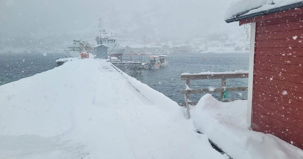 “Shit – dikke bewolking en sneeuw” schoot er door mijn hoofd, toen ik het gordijn om 06.30 uur open deed en naar buiten keek. Dat is namelijk altijd het eerste dat ik doe wanneer ik wakker word tijdens een vistrip – naar buiten kijken. Wat een andere wereld dan gisteren! Snel even yr.no checken… Aaargh, de eerste blik op deze app was ook al niet erg hoopgevend; windkracht 4 uit zuidoost en rond de middag draait hij naar noordoost en neemt ook nog eens fors toe, tot zelfs stoten van 8 Beaufort. En daarnaast de hele dag door zware sneeuwval. Hmmm, meteen twijfels over het skrei-vissen, want dit zijn geen omstandigheden om op open zee te gaan vissen.