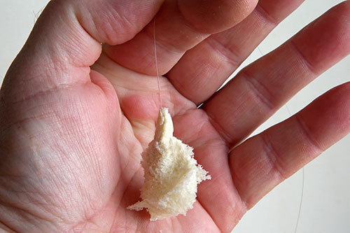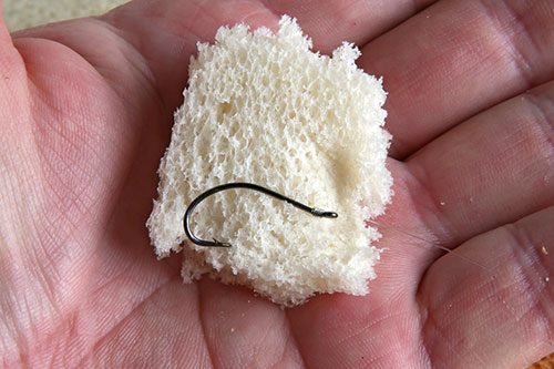 Gebruik geen al te kleine haak, want in hun vreetlust slikken de windes de vlok of korst razend snel in. Een karperhaak in maat no. 4 vind ik ideaal. Vouw een vlok vers wit brood om je haak en draai een ‘toetertje’ rond het oogje, daar waar je onderlijn aan de haak is geknoopt. De vlok zit nu stevig aan je haak vast, terwijl de rest van de vlok genoeg water op kan zuigen en dat zal het werpen bevorderen. Bij een aanbeet zal de haak nu bovendien sneller haken door het weke brood.