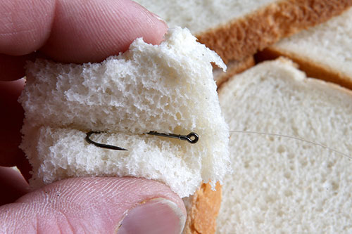 De vlok of broodkorst kan ook door middel van een baitband aan de haak worden gemonteerd en op deze manier blijft de haakbocht helemaal vrij. Dat komt de inhakingskans beslist ten goede. Deze elastiekjes kun je kopen in alle hengelsportwinkels.