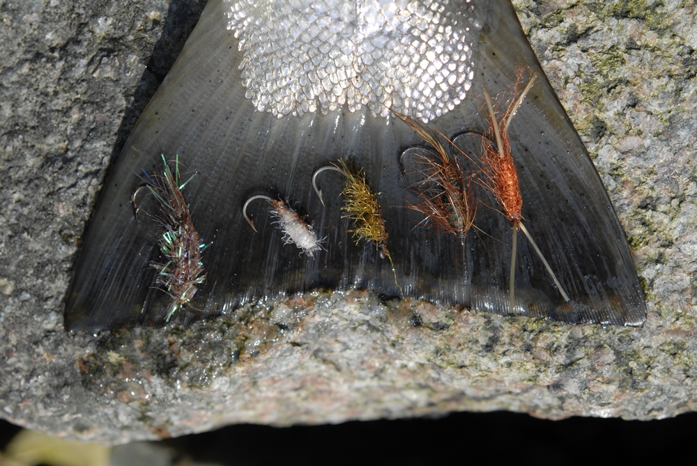 Met deze vliegen in zijn doos houdt Mikael goed in de gaten welke beestjes bij het waden uit de modder of het wier schieten. Maar wil je het echt weten? Dan moet je eigenlijk de maaginhoud van een schoongemaakte zeeforel controleren. Die moet je dan natuurlijk wel eerst zien te vangen.